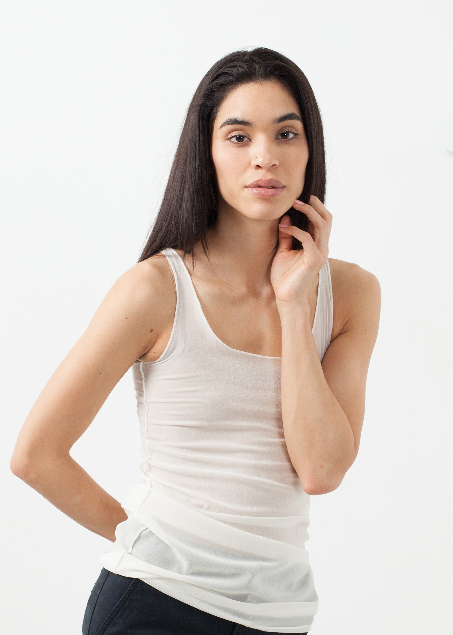 The Long Tank adds dimension with only the slightness of sheer. Textural beauty with exposed seams. Album di Famiglia. Color Cream. 93% Silk, 7% Elastane. Made in Italy. Ashley is wearing an X Small.