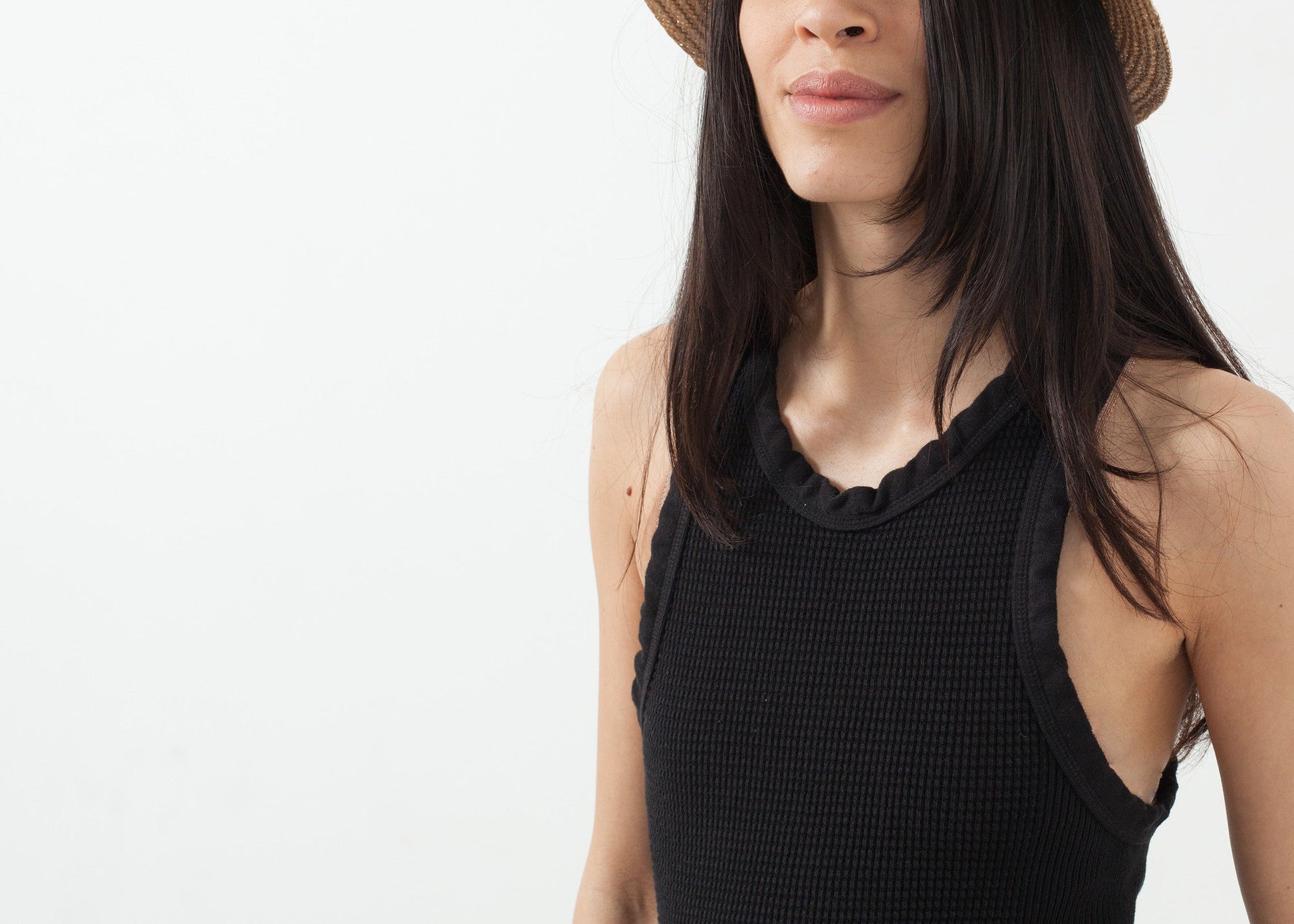 The combination of waffle and rib knits offers uniqueness in look with lots of stretch for perfection in fit. Crew neckline. Extended button placket at front. V:Room. Color Black. 100% Cotton. Made in Japan. Ashley is wearing an S/M.
