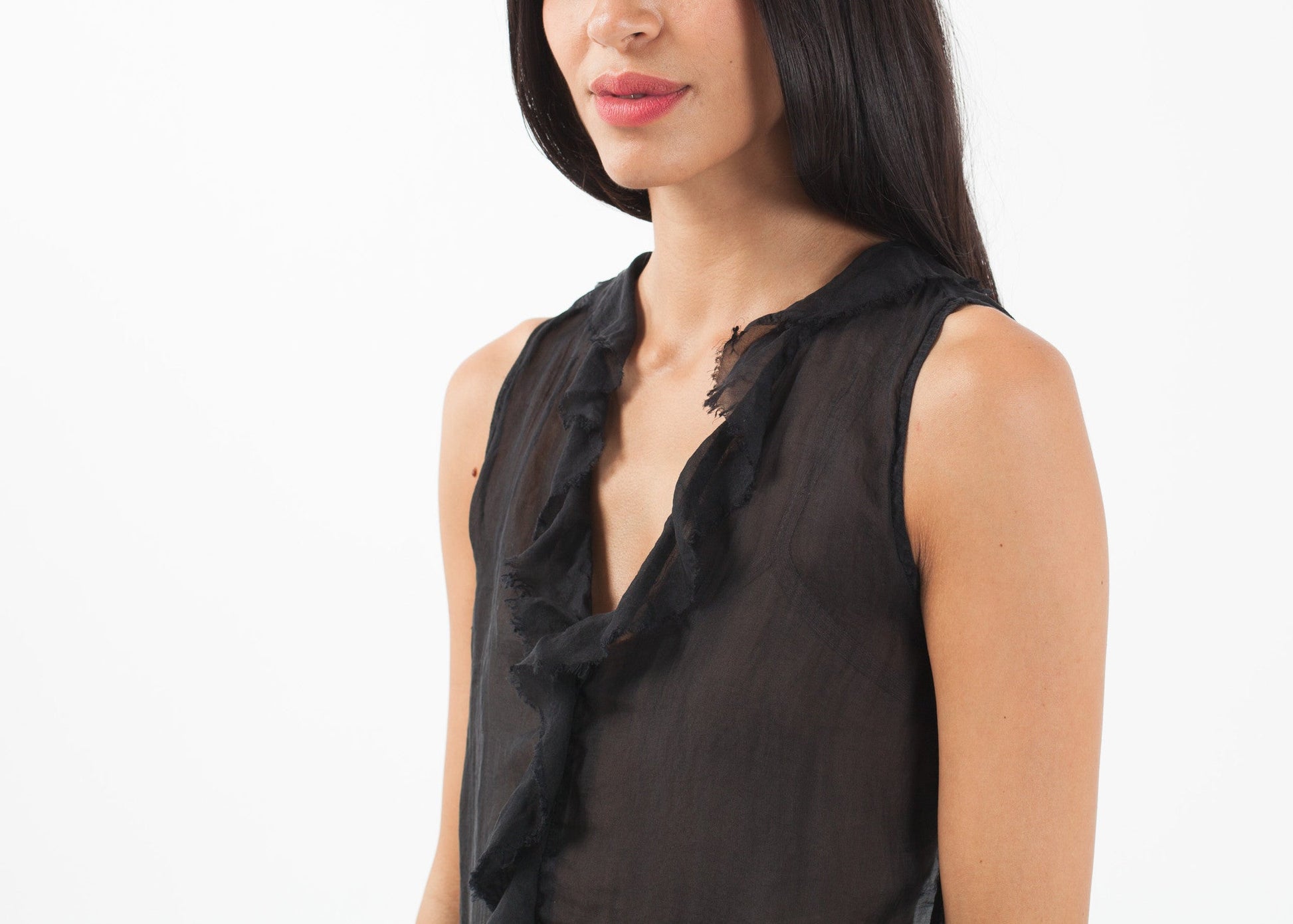 Soft ruffling frames the neck in the Fair Top. Delicate and poised. Pip-Squeak Chapeau. V-neckline. Color Black. 100% Organza. Made in U.S.A. Ashley is wearing a Small.